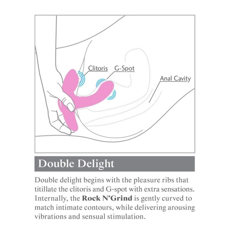 Rock N' Grind est un jouet de plaisir personnel à double moteur pour vous exciter à l'intérieur comme à l'extérieur ! Parfaitement courbé et agréablement nervuré pour une excitation supplémentaire, ce trésor vibrant peut ravir doublement votre point G et votre clitoris en même temps - avec ou sans la télécommande intelligente. Utilisez la sangle de positionnement pour le serrer contre vous, faire du rock and roll ou faire une balade amusante !