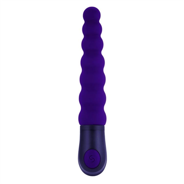 Ce vibromasseur perlé légèrement arqué a 3 ampoules spongieuses à son sommet flexible et 4 ampoules fermes à mesure qu'elles grossissent vers la base, se terminant par une commande à 1 bouton.