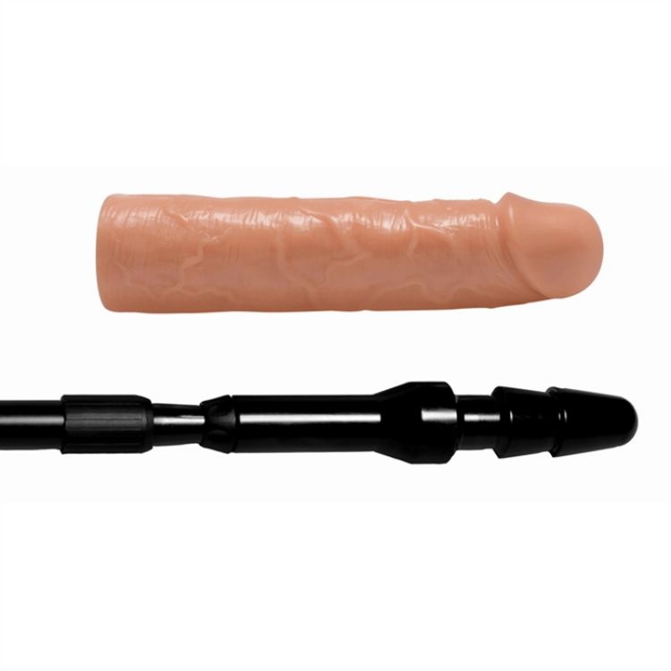 Mesures : Le gode mesure 6,75 pouces de longueur et 1,5 pouces de diamètre. La tige mesure 28 pouces de longueur, non étendue et incluant les poignées. L'extension minimale est de 14,25 pouces de longueur, 21 pouces, gode compris. L'extension maximale est de 42 pouces de longueur, 48,75 pouces, gode compris.